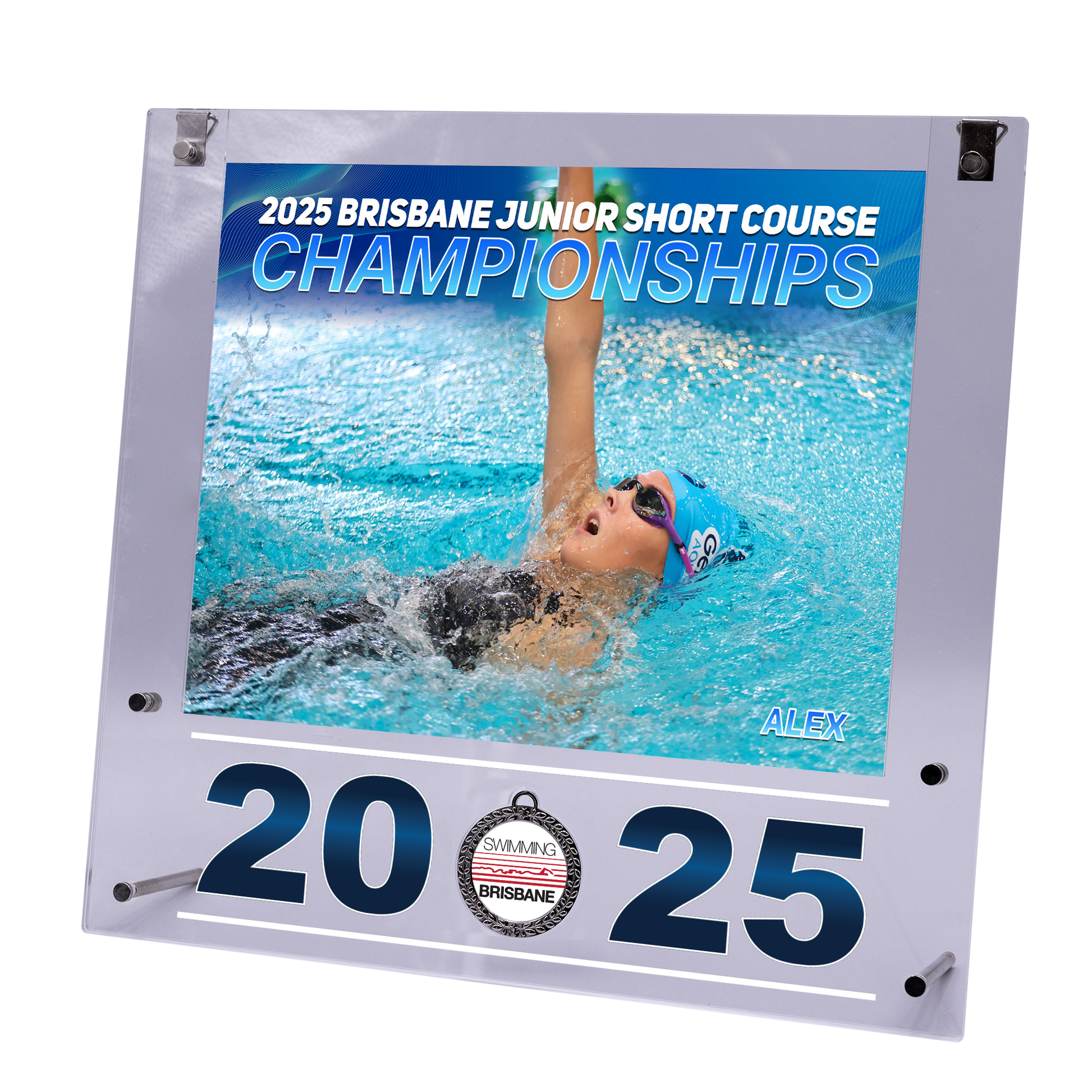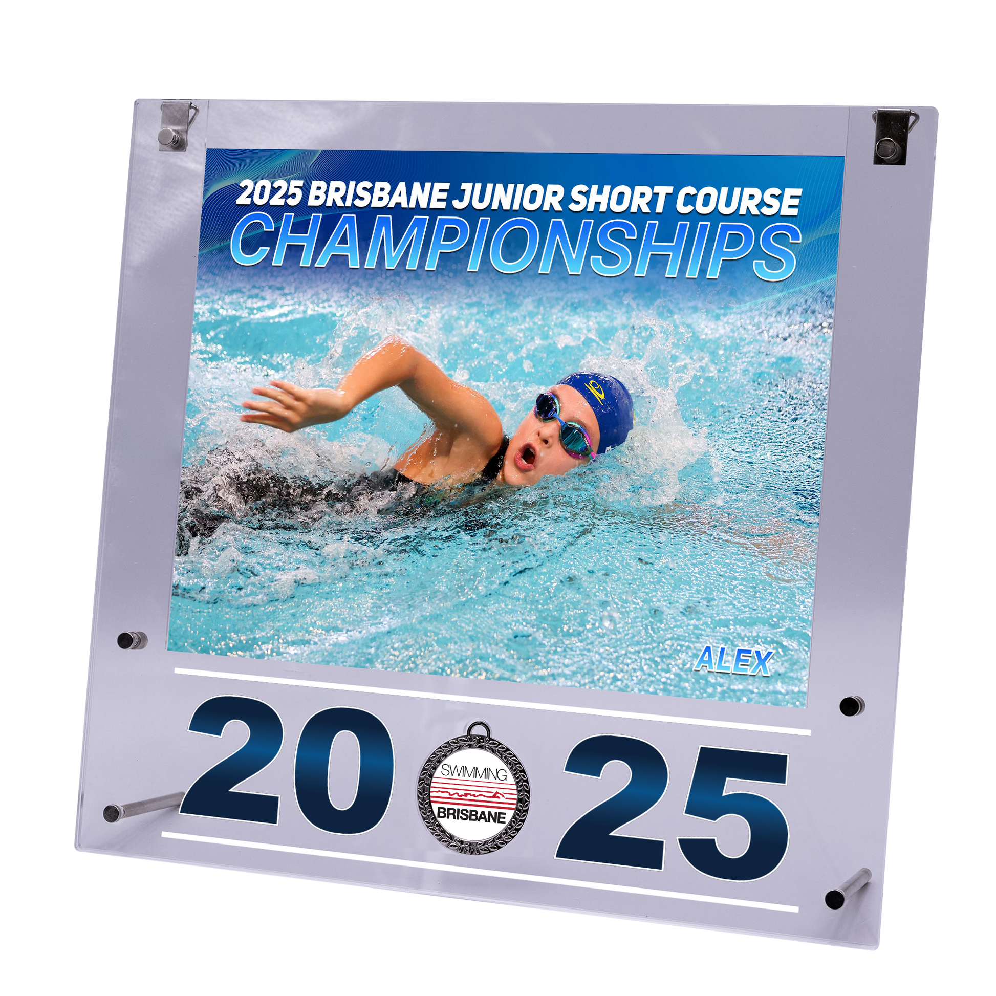 Large Acrylic Frame with medal + Customised Photo Print with event artwork and name. We just require the event number when you place your order and we will look up the heat + lane when the final program is released.